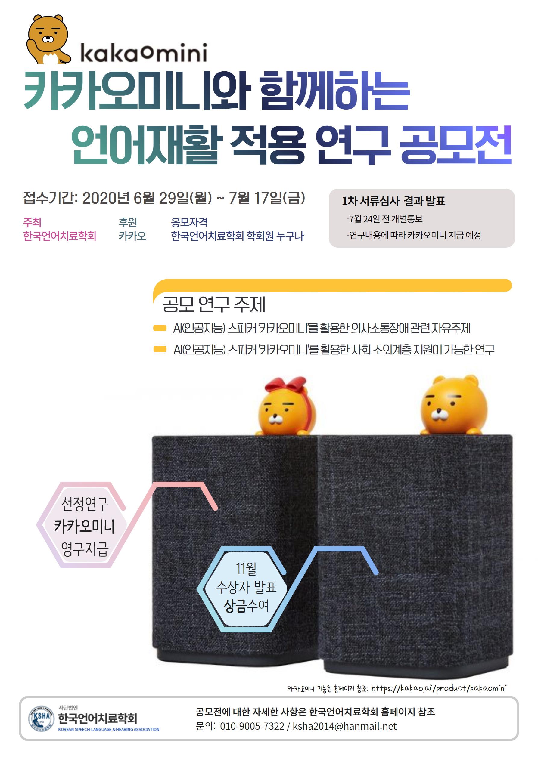 카카오 그룹(카카오미니)과 함께 인공지능(AI) 관련 연구 분위기 조성확산 및 의사소통장애인의 ‘삶의 복지를 보다 효과적으로 지원할 수 있는 임상적 근거를 마련하고자 음성기반 시스템의 카카오미니 ‘인공지능스피커를 이용한 공모전을 개최합니다.