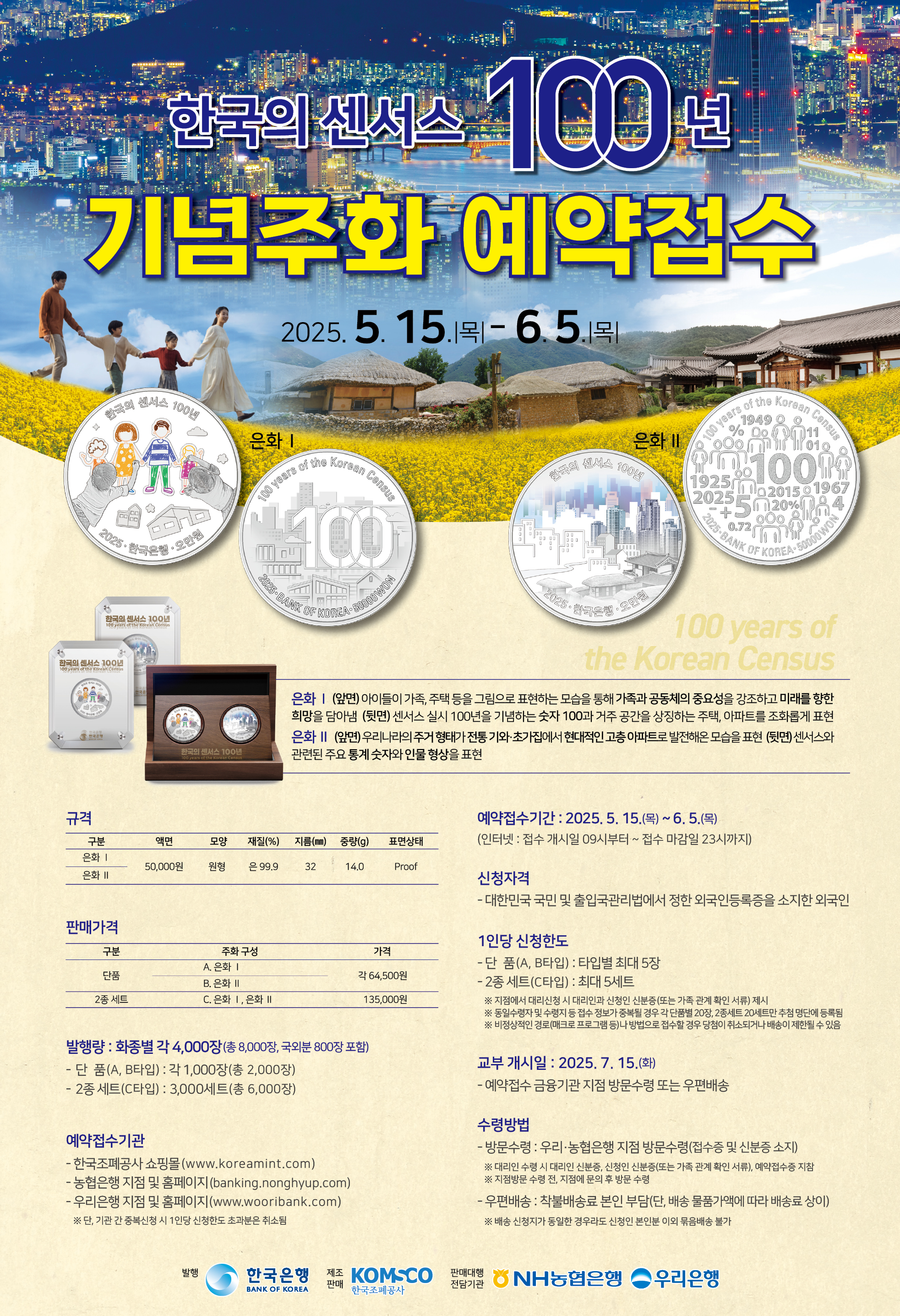 기념주화의 예약접수기간은 2025.5. 15.(목) ~ 6. 5.(목) (인터넷 : 접수 개시일 09시부터 ~ 접수 마감일 23시까지)이오니 관심있는 회원께서는 첨부된 포스터를 참고하시기 바랍니다.