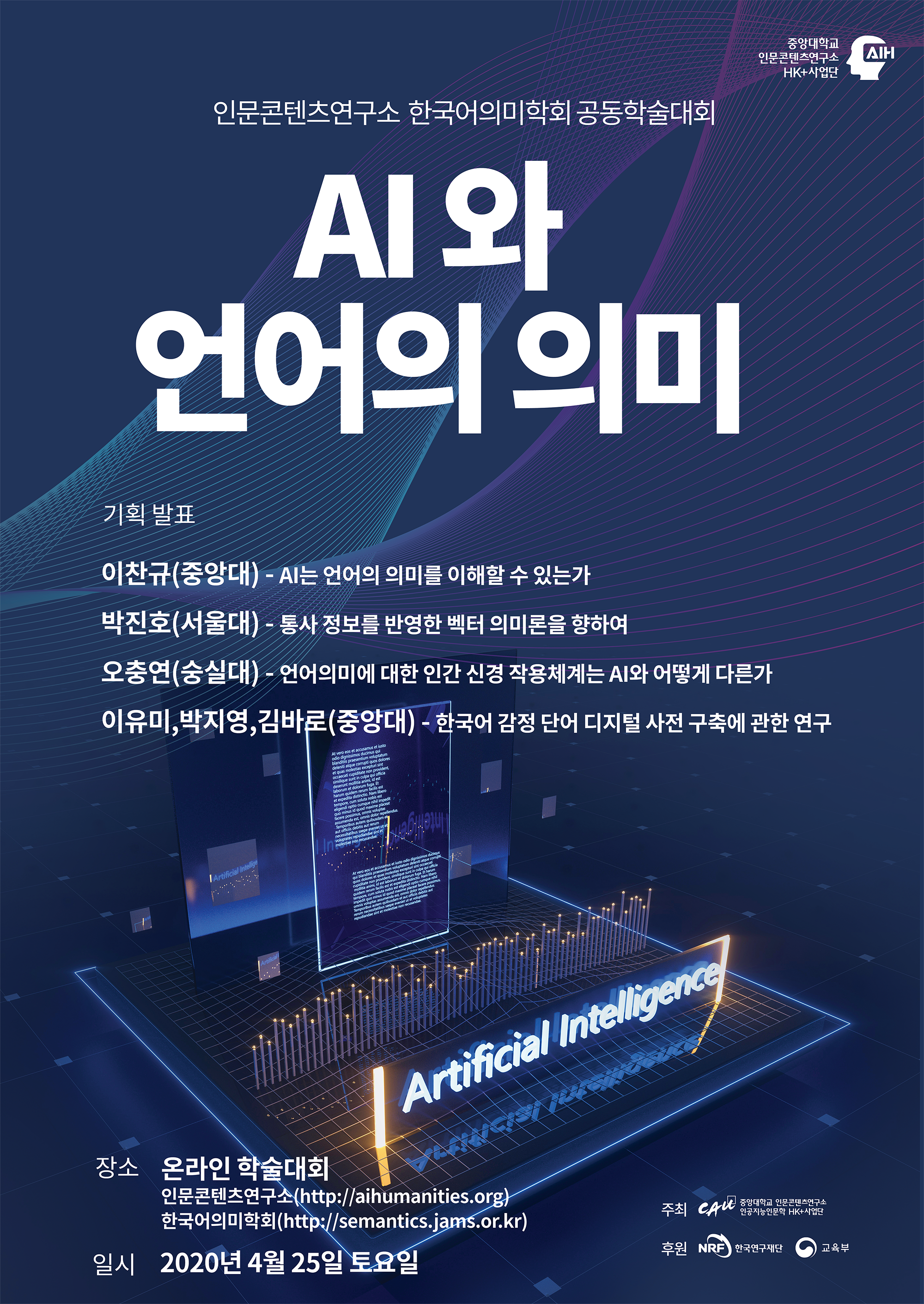 이번 학술 대회는 중앙대학교 인문콘텐츠 연구소와 공동학술대회로 치러지며, ‘AI와 언어 의미’라는 주제로 두 분의 기조 강연과 두 분의 기획 발표가 진행될 예정입니다.